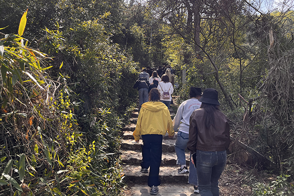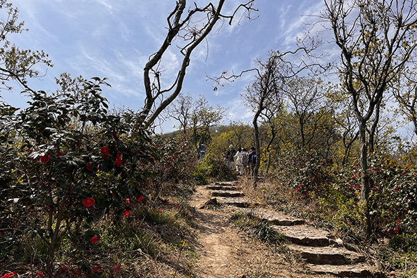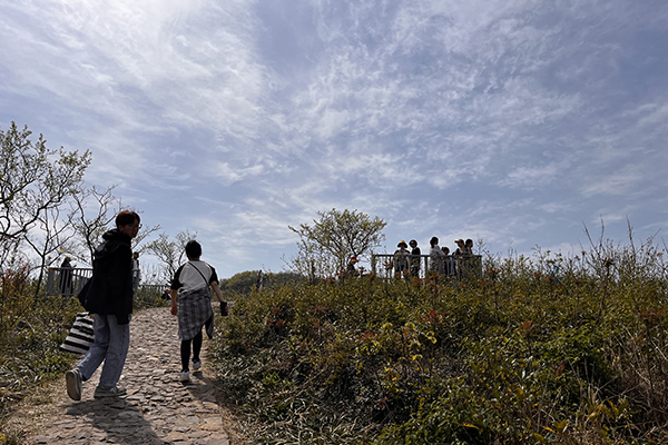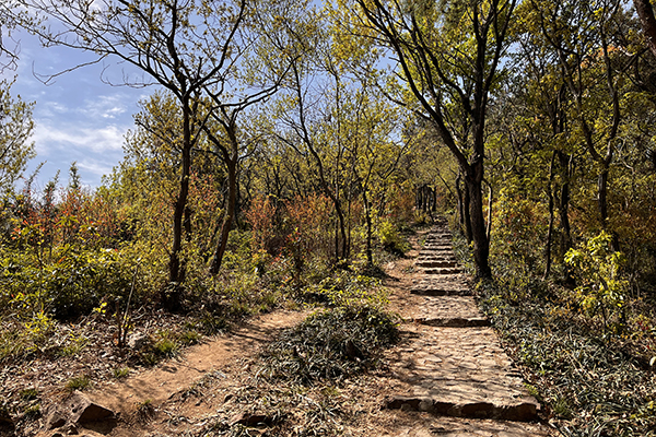 春風(fēng)裹挾著草木的清氣,在耳畔絮語(yǔ)。天朗氣清,同事們身著輕便裝束,三三兩兩結(jié)伴而行,起初石階尚算平緩,還能輕松談笑。行至半路,領(lǐng)頭的幾個(gè)年輕人早已不見(jiàn)蹤影,中間的一撥走走停停,不時(shí)掏出手機(jī)拍照,或是扶著膝蓋喘幾口粗氣。落在后頭的幾位,索性尋了塊平整的石頭坐下,掏出水壺慢飲,倒像是在自家庭院納涼。